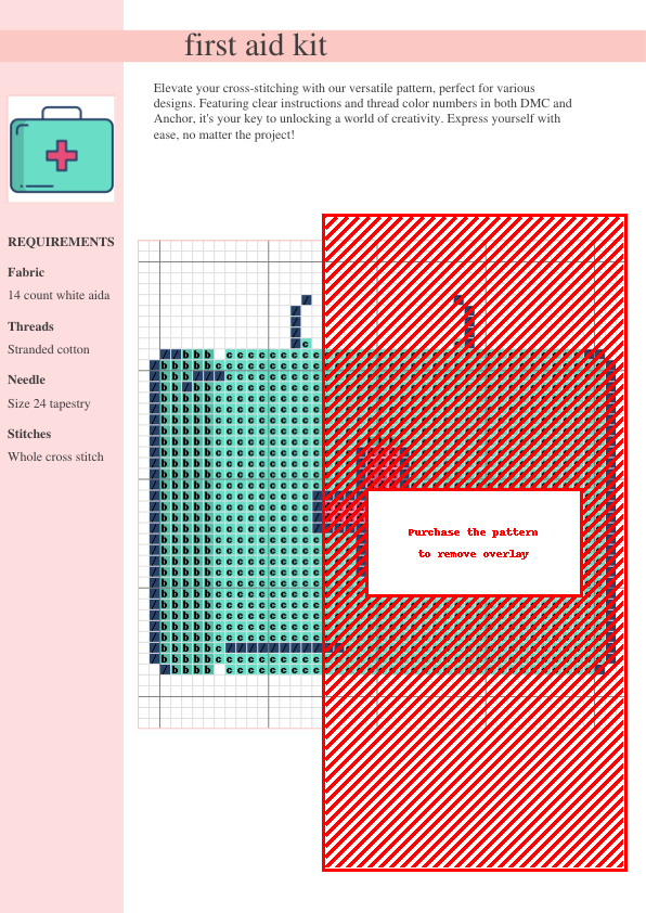 Stitch up some heartwarming charm with this delightful First Aid Kit cross stitch pattern! This versatile design is perfect for adding a touch of whimsy to your home décor, creating a unique and thoughtful gift, or simply enjoying a relaxing crafting session. The pattern features a detailed and charming illustration of a first aid kit, brimming with personality and perfect for adding a personal touch to any space. Clear instructions and a comprehensive color key are included, listing thread color numbers for both DMC and Anchor brands, ensuring a smooth and enjoyable stitching experience. This downloadable PDF pattern is a two-page document containing the symbol chart and a complete thread list. This pattern is suitable for cross-stitch enthusiasts of all skill levels, from beginners seeking a fun project to experienced stitchers looking for a charming addition to their portfolio. The design is both adorable and practical, making it a perfect project for any occasion. Imagine the joy of gifting this handmade treasure, or the satisfaction of adding a unique, personalized touch to your home. Let your creativity bloom with this sweet and unique design!