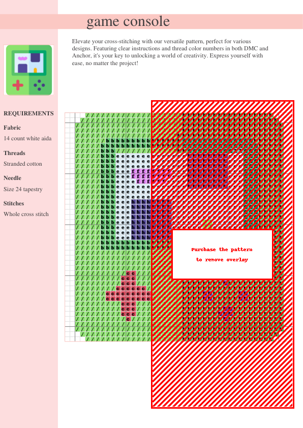 Downloadable PDF cross stitch pattern of a retro game console. Includes DMC and Anchor thread color codes for easy stitching. Easy-to-follow instructions perfect for beginners and experienced stitchers! Stitch your own pixel art and add retro charm to your home. Finished size: [Specify finished size, e.g., 6×6 inches].