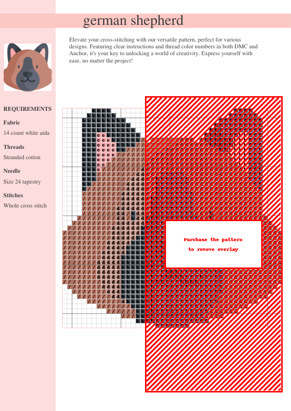 Celebrate the unwavering loyalty of your canine companion with this exquisite German Shepherd cross-stitch pattern! This downloadable PDF pattern offers clear, easy-to-follow instructions and a comprehensive color key using both DMC and Anchor thread numbers, making it perfect for cross-stitchers of all skill levels, from beginner to intermediate. The detailed design captures the majestic beauty of this beloved breed, showcasing its expressive eyes and the elegant texture of its coat. The pattern is designed to create a heartwarming wall hanging, a unique and thoughtful gift for a dog lover, or a charming addition to your own crafting collection. This challenging yet rewarding project allows you to create a cherished piece of art celebrating the special bond between humans and their canine companions. Download your pattern instantly after purchase and start stitching your furry friend today! The finished piece is approximately [Insert Finished Size Here] and is perfect for adding a personalized touch to home decor or gifting to a beloved friend or family member. Embark on this stitching adventure and create a lasting tribute to the love and loyalty of your German Shepherd.