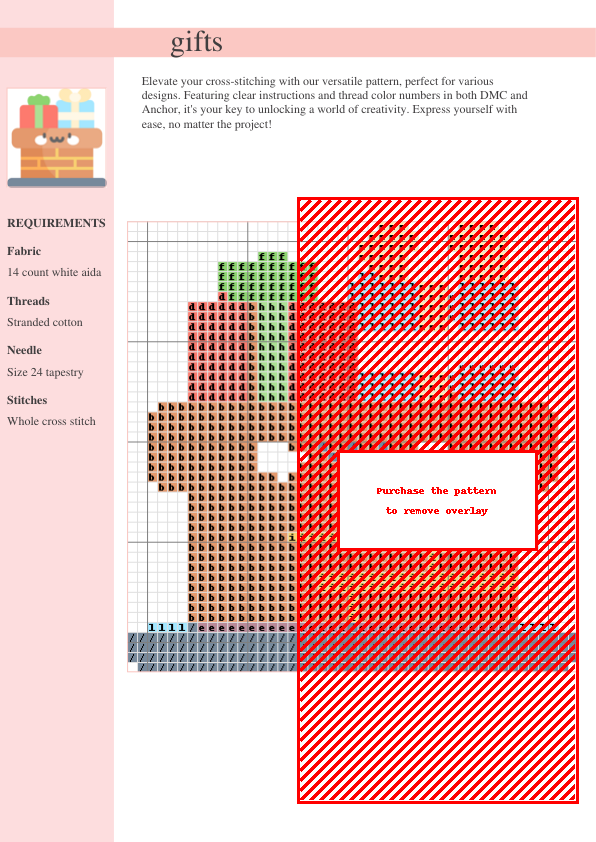 Unleash your creativity with our adorable “Gifts” cross-stitch pattern! This versatile design is perfect for crafting personalized presents, festive home décor, or simply enjoying a delightful stitching project. The pattern showcases a charming collection of beautifully rendered gifts, ideal for birthdays, holidays, or any special occasion. Customize the colors to perfectly match your style or any theme! Our easy-to-follow instructions include a comprehensive thread color chart using both DMC and Anchor thread numbers, ensuring a smooth and enjoyable stitching experience. This digital PDF download provides a two-page pattern with clear symbols and a complete thread list, allowing you to start stitching immediately. Whether you’re a seasoned cross-stitcher or a beginner looking for a rewarding project, this pattern guarantees hours of creative fun. Stitch up some heartfelt presents and let your needlework tell a story! The design is perfect for adding a personal touch to gifts or creating festive home accents. Download your pattern now and start stitching! This pattern is easily customizable for any occasion and is sure to become a treasured keepsake. Includes both DMC and Anchor thread equivalents for easy access to materials. Add a personal touch to your gifts this year with this charming and versatile design.