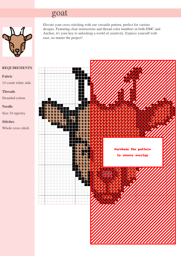 Create a charming cross-stitch of an adorable goat with this easy-to-follow pattern. Includes DMC and Anchor thread color codes for a seamless stitching experience. Instant PDF download after purchase. Perfect for beginners and experienced cross-stitch crafters! Add a touch of farmhouse style to your home décor or create a unique gift.