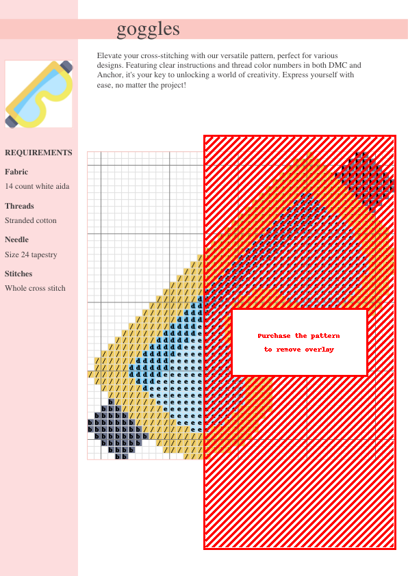 Stitch up a pair of trendy goggles with this easy-to-follow cross-stitch pattern! This versatile design is perfect for adding a quirky, fun touch to your projects – imagine them adorning a whimsical tote bag, a playful pillow, or even a unique piece of wall art. The pattern features a clear, concise chart and a color key with corresponding DMC and Anchor thread numbers, making it accessible to both beginners and experienced cross-stitchers. The downloadable PDF includes a detailed stitch guide and a comprehensive thread list for a smooth stitching experience. Embrace your creativity and add a touch of cool to your crafting world! This digital pattern is instantly downloadable, so you can start stitching right away. Perfect for adding a unique, handmade touch to your projects, this pattern offers a simple yet stylish design suitable for all skill levels. Download your pattern now and let your needle do the talking! This fun project is ideal for cross stitch enthusiasts of all levels, from beginners looking for a quick win to experienced stitchers seeking a charming addition to their repertoire. The finished piece adds a touch of modern flair to any creation.