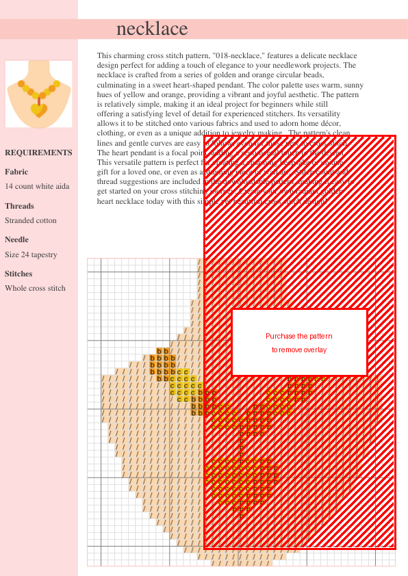 Stitch up a radiant piece of wearable art with our ‘018-necklace’ cross stitch pattern! This charming design features a delicate necklace adorned with golden and orange circular beads, culminating in a sweet heart-shaped pendant. The warm, sunny color palette of yellows and oranges creates a vibrant and joyful aesthetic, perfect for adding a touch of elegance to your needlework projects. This pattern is surprisingly simple, making it ideal for beginners, yet offers enough detail to satisfy experienced stitchers. The clean lines and gentle curves are easy to follow, resulting in a beautiful, sentimental keepsake or a unique gift. Use this pattern to embellish clothing, create unique jewelry, or add a special touch to your home décor. The downloadable PDF pattern includes stitch counts, a color key, and thread suggestions for a seamless crafting experience. Unleash your creativity and make your own radiant golden heart necklace today! Perfect for cross stitch enthusiasts of all skill levels. Download instantly and begin your next crafting adventure!