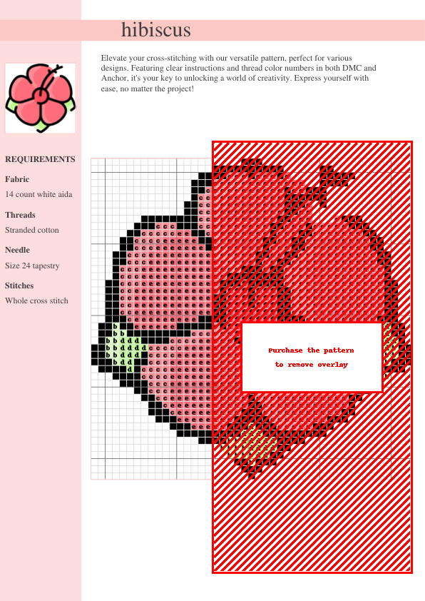 Unleash your creativity with our stunning Hibiscus Bloom cross stitch pattern! This vibrant design features a detailed tropical hibiscus flower, bursting with color and ready to add a touch of exotic elegance to your home. Perfect for both beginner and experienced cross-stitchers, this pattern offers a rewarding crafting experience. The easy-to-follow instructions and comprehensive thread color codes for both DMC and Anchor brands ensure a smooth stitching process. The downloadable PDF includes a full-color chart with symbols, a complete thread list with color key, a materials list, and detailed instructions. Imagine the satisfaction of creating this exquisite artwork – a stunning addition to your cross-stitch collection, ideal for home décor, wall art, or a thoughtful handmade gift. The intricate details of the hibiscus petals and leaves provide a beautiful challenge, while the clear instructions make it accessible to all skill levels. Download your pattern today and let your creativity blossom!