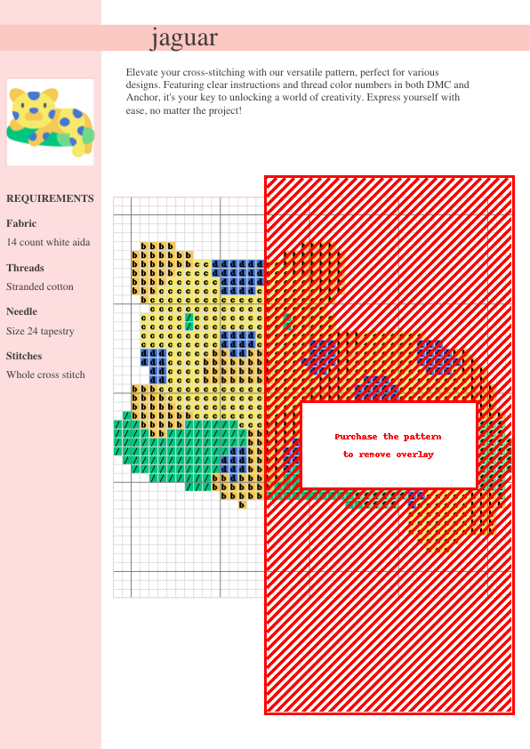 Unleash your inner artist with our breathtaking Majestic Jaguar Cross Stitch Pattern! This intricately designed pattern captures the powerful beauty and majestic grace of a jaguar in a vibrant and captivating design. Perfect for experienced stitchers seeking a challenging project and ambitious beginners ready to elevate their skills, this pattern offers a rewarding stitching experience. The pattern boasts a rich color palette, bringing the jaguar to life with incredible detail and texture. Clear, easy-to-follow instructions and a comprehensive thread color chart featuring both DMC and Anchor thread numbers ensure a smooth and enjoyable stitching process. This two-page PDF pattern includes a symbol chart and a complete thread list for effortless stitching. Imagine the finished piece as a striking addition to your home décor, a unique and thoughtful gift, or a proud centerpiece in your personal cross-stitch collection. Download your PDF pattern instantly after purchase and embark on this exciting cross-stitch adventure to create a truly majestic masterpiece! This pattern is ideal for intermediate to advanced stitchers looking for a challenging and rewarding project. The detailed rendering of the jaguar’s fur and eyes will provide a satisfying and beautiful final product.