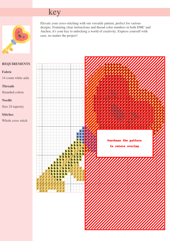 Elevate your cross-stitch projects with this charming and easy-to-follow key pattern! This downloadable PDF pattern provides clear instructions and a color key using both DMC and Anchor thread numbers, making it perfect for crafters of all skill levels. The design features a beautifully rendered key, adding a touch of whimsy and charm to your creations. Its intricate details, such as the subtle shading and texture, offer a rewarding stitching experience. Use this delightful key as a standalone piece for a cute home décor accent, incorporate it into a larger project, such as a sampler or a key-themed wall hanging, or even adapt it to create your own unique variations. Perfect for adding a touch of personalized flair to home décor, gifts, or personal accessories. Download your pattern instantly after purchase and get stitching! The PDF includes a full-color chart with symbols, a complete thread list for both DMC and Anchor threads, and a detailed stitch guide for beginners. This pattern is a fantastic way to practice your cross-stitch skills or add a unique element to your next project. Let your creativity unlock with this delightful key design!