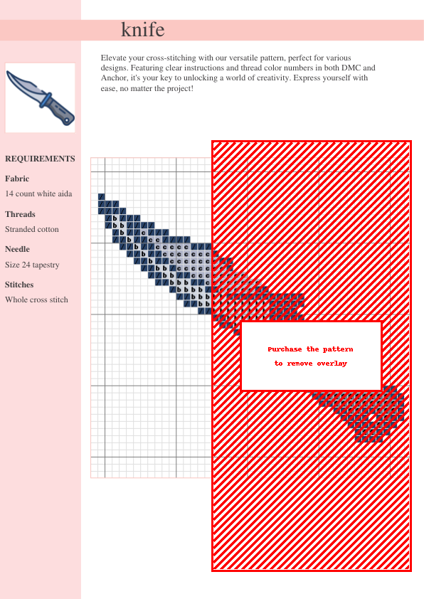 Unleash your inner artist with this edgy and elegant cross-stitch pattern! This downloadable PDF pattern is a perfect project for intermediate cross-stitchers seeking a challenging and rewarding experience. The striking knife design offers a unique blend of sophistication and intrigue, perfect for adding a touch of modern flair to your home decor or crafting projects. Its detailed design allows for both precise stitching and creative interpretation – make it truly your own! The clear, easy-to-follow instructions include thread color codes for both DMC and Anchor brands, ensuring a seamless stitching experience. The pattern features a full symbol chart, a complete thread list, and is presented across two convenient pages for easy printing and stitching. Transform this pattern into a stunning piece of wall art, a unique needlepoint accessory, or a personalized gift for a friend or family member. Download instantly and start stitching your masterpiece today! This pattern is ideal for those who enjoy detailed projects and modern, minimalist designs. Add this unique and sophisticated pattern to your cross-stitch collection and experience the satisfaction of creating something sharp and stylish. Perfect for intermediate cross stitch enthusiasts, modern home decor, unique gifts, needlepoint projects, and minimalist design lovers.