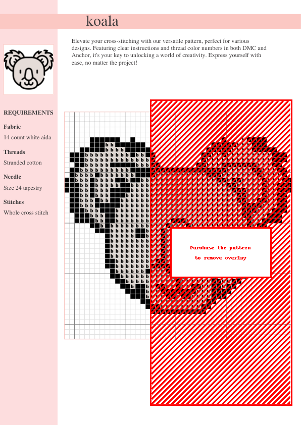 Create an adorable koala cross-stitch! This easy-to-follow pattern includes DMC & Anchor thread codes, a detailed color chart, and an instant PDF download. Perfect for all skill levels – from beginner to expert stitcher. Enjoy this relaxing and rewarding crafting project! Instant download, printable pattern.