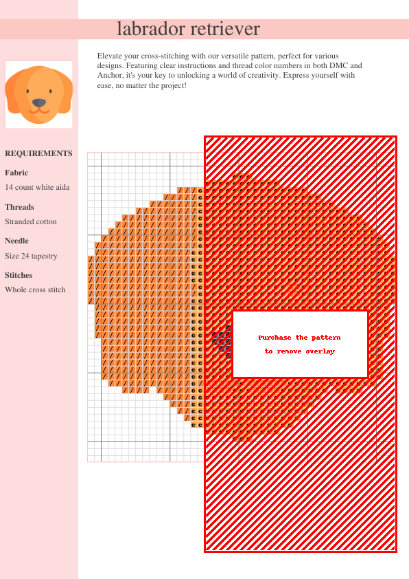 Create an adorable Labrador Retriever cross-stitch with this easy-to-follow pattern! Includes DMC & Anchor thread color codes for convenient stitching. Instant PDF download! Perfect for beginners and experienced stitchers. Add a touch of canine charm to your home or create a unique gift. This high-quality pattern provides a clear symbol chart and complete thread list for easy stitching.