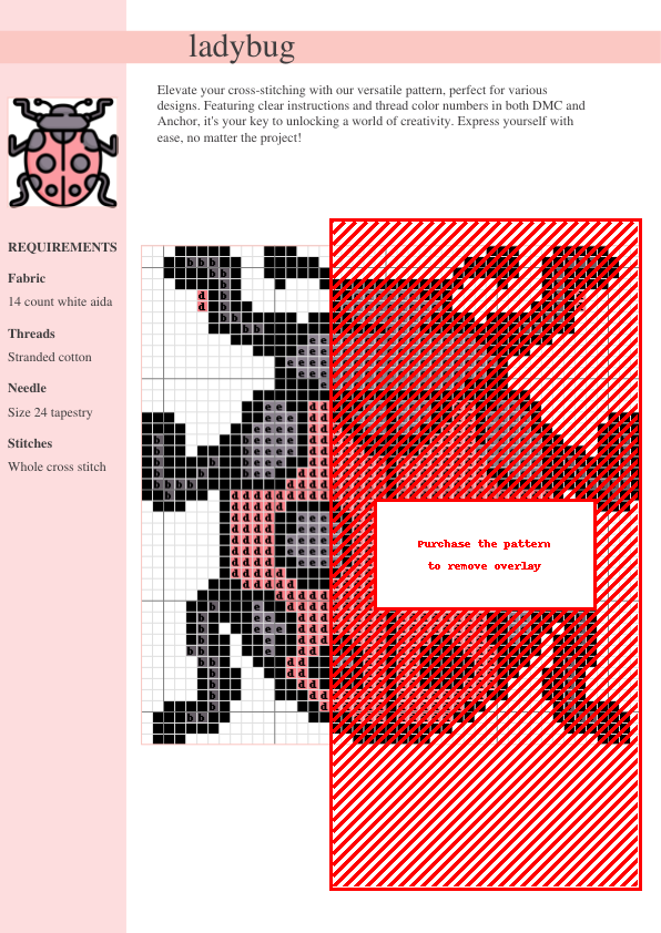 Stitch up springtime joy with this delightful ladybug cross stitch pattern! Featuring a charming ladybug nestled amongst vibrant wildflowers, this design is perfect for beginners and experienced stitchers alike. The clear, easy-to-follow instructions include both DMC and Anchor thread color charts, ensuring a seamless stitching experience. This two-page PDF download provides comprehensive symbol charts and a complete thread list, making it simple to gather your materials and begin your project. The intricate details of the ladybug and wildflowers create a sweet and whimsical scene, ideal for adding a touch of nature to your home décor, creating personalized gifts, or expanding your cross-stitch sampler collection. Whether you’re a seasoned crafter seeking a quick and satisfying stitch or a beginner looking for an enchanting project, this adorable ladybug pattern is sure to bring a smile to your face and a sense of accomplishment to your crafting journey. Download instantly and start stitching today!