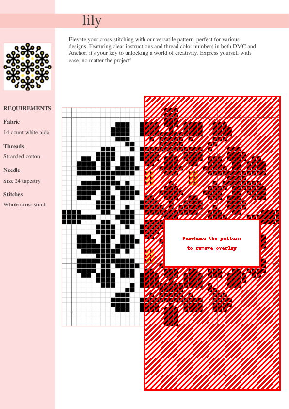 Elevate your crafting projects with our enchanting Lily Cross Stitch Pattern! This downloadable PDF includes a charming floral design, clear instructions, DMC & Anchor thread color keys, and is perfect for all skill levels. Download and start stitching your beautiful lily today!