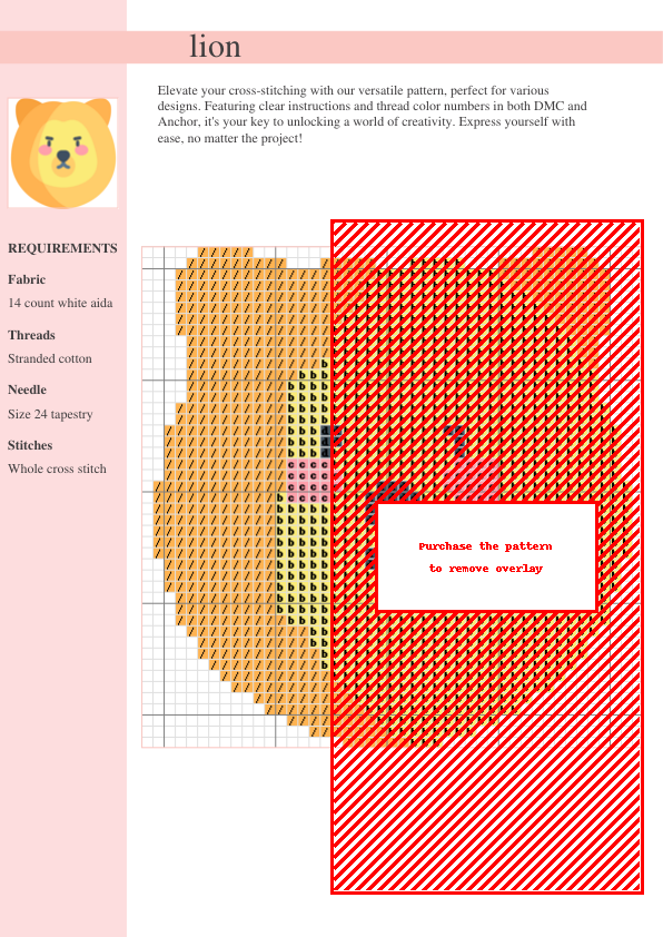 Unleash your inner artist with our stunning Majestic Lion Cross Stitch Pattern! This regal design, perfect for both experienced stitchers and confident beginners, features a majestic lion rendered in intricate detail. Its powerful mane and expressive eyes are captured with precision, bringing a touch of wild elegance to your next crafting project. The clear and concise instructions include DMC and Anchor thread color numbers for easy color matching, ensuring a seamless stitching experience. Your instant PDF download includes a two-page design chart with easily readable symbols and a comprehensive thread list. Create a breathtaking piece of art to adorn your home, gift to a loved one, or proudly display as a testament to your crafting skills. This pattern is ideal for cushions, wall hangings, samplers, or framed artwork. Available in [mention size if applicable, e.g., 10×10 inches], the color palette features rich golds, deep browns, and subtle creams, creating a truly majestic final piece. Let your creativity roar!
