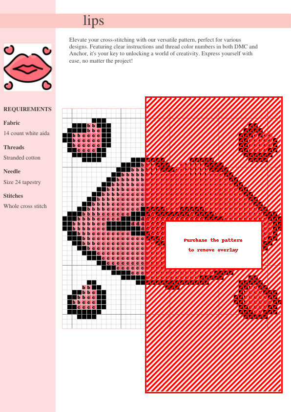 Stitch up some serious style with our ‘Pouty Lips’ cross stitch pattern! This chic and contemporary design is perfect for cross-stitch enthusiasts of all skill levels. Beginners will appreciate the easy-to-follow instructions, while experienced crafters will enjoy the stylish and unique design. The pattern features a trendy depiction of pouty lips, offering a modern twist on traditional cross-stitch. This instantly downloadable two-page PDF pattern includes a complete color symbol chart, a comprehensive thread list with both DMC and Anchor thread color codes, and clear instructions to ensure a smooth stitching experience. The adaptable color palette allows for customization, letting you create a stunning wall hanging, a quirky pillow, a personalized gift, or any other project that matches your personal style. Unleash your creativity and add a touch of modern art to your home decor or gift-giving! Download your pattern now and start stitching! This digital download is perfect for adding a pop of color and personality to your crafting projects. The design is both fun and sophisticated, making it a perfect project for yourself or a thoughtful gift for a fellow crafter.