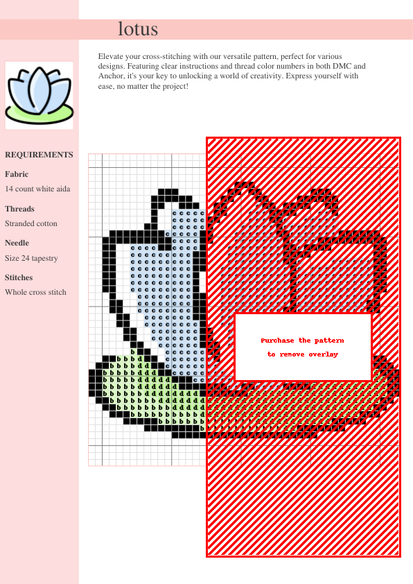 Unwind and create with our Serene Lotus Flower Cross Stitch Pattern! This meticulously crafted design captures the peaceful beauty of a blooming lotus blossom. The detailed, easy-to-follow instructions include a comprehensive color symbol chart using both DMC and Anchor thread color codes, making it simple to gather your supplies. The pattern is suitable for various projects, from a calming wall hanging or elegant cushion cover to a stunning element in a larger sampler. Whether you’re a beginner cross-stitcher seeking a relaxing project or an experienced crafter looking for a beautiful new design, this instantly downloadable PDF pattern is perfect. Experience the therapeutic joy of stitching and create a serene masterpiece to cherish or gift. Download your pattern now and let your creativity bloom!