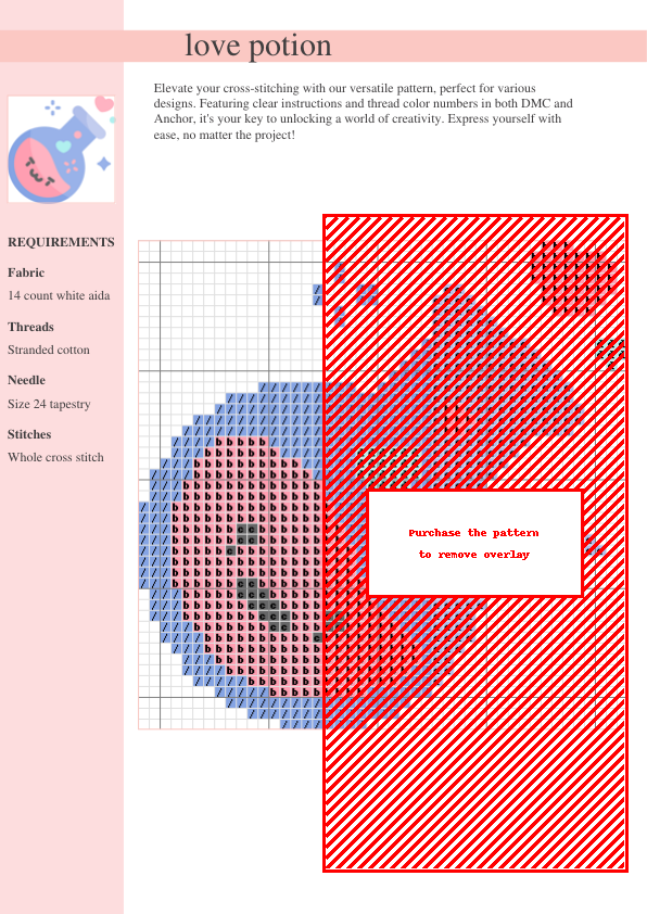 Unleash your inner romantic with our enchanting ‘Love Potion’ cross stitch pattern! This charming design features a heart-shaped bottle overflowing with a magical love potion, perfect for adding a touch of whimsy to your crafting projects. Imagine this captivating image adorning pillows, wall hangings, or unique handmade gifts. The pattern boasts a soft, romantic color palette, easily recreated using the included DMC and Anchor thread color codes. This beginner-friendly pattern provides clear, concise instructions, a detailed symbol key, and a complete thread list on two easy-to-follow PDF pages. Instantly download your pattern after purchase and begin stitching! With its versatile design, it transcends cross-stitch, lending itself beautifully to needlepoint and other embroidery projects. Create a truly personalized, heartfelt gift or home decor treasure infused with love and charm. Perfect for Valentine’s Day, anniversaries, or any occasion. Download your pattern instantly and let the love potion inspire your next crafting adventure! This digital download includes both a color and a black and white version of the pattern.