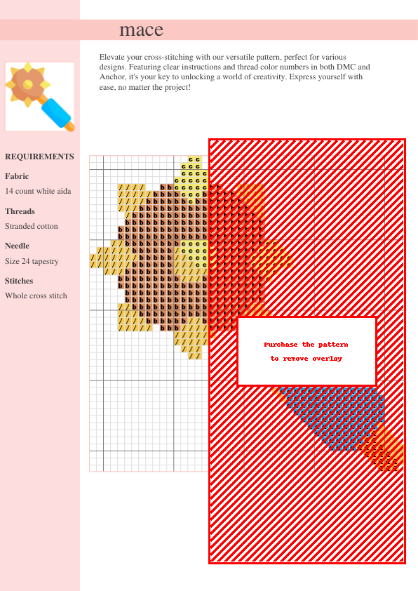 Unleash your inner artisan with this meticulously crafted Medieval Mace cross stitch pattern! This challenging yet rewarding design boasts a striking level of detail, perfect for experienced stitchers. The powerful mace is rendered in rich, saturated colors, creating a captivating centerpiece for your home, a unique gift for history buffs, fantasy enthusiasts, or a stunning addition to a medieval-themed room. The easy-to-follow instructions include corresponding thread color numbers for both DMC and Anchor threads, ensuring a smooth stitching experience. This instant-access PDF pattern includes a color-coded symbol chart, a complete thread list, and is designed for easy printing across two pages. Add a touch of medieval flair to your cross-stitch collection with this magnificent design! Perfect for intermediate to advanced stitchers looking for a detailed and rewarding project. Download your pattern immediately after purchase and begin your embroidery adventure! This pattern is ideal for those who enjoy intricate designs and historical themes in their needlework. The finished piece will make a statement wherever it’s displayed. Suitable for experienced cross-stitchers seeking a challenging and visually impressive project.