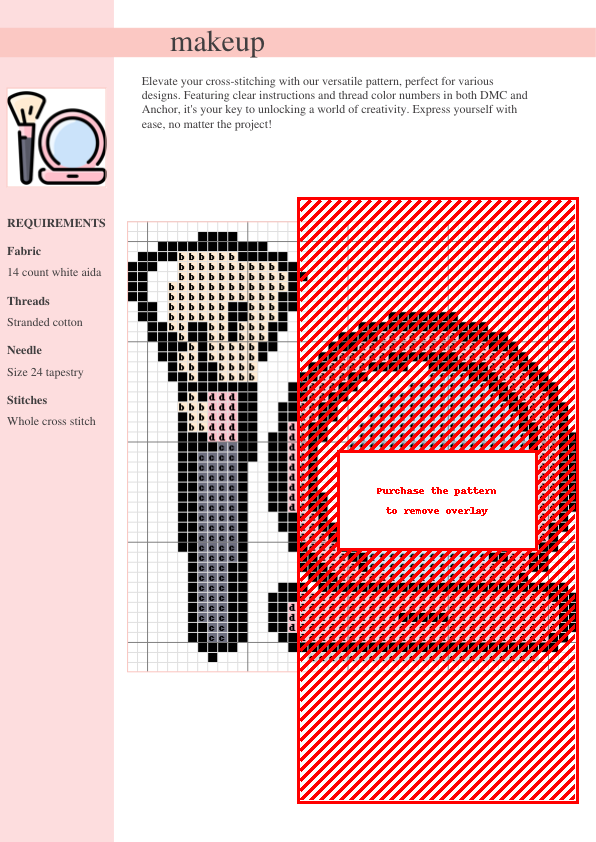 Create a glamorous cross stitch masterpiece with our “Glamorous Makeup” pattern! This downloadable PDF includes detailed instructions and DMC/Anchor thread color codes for a beautiful and personalized project. Perfect for beginners and experienced stitchers.