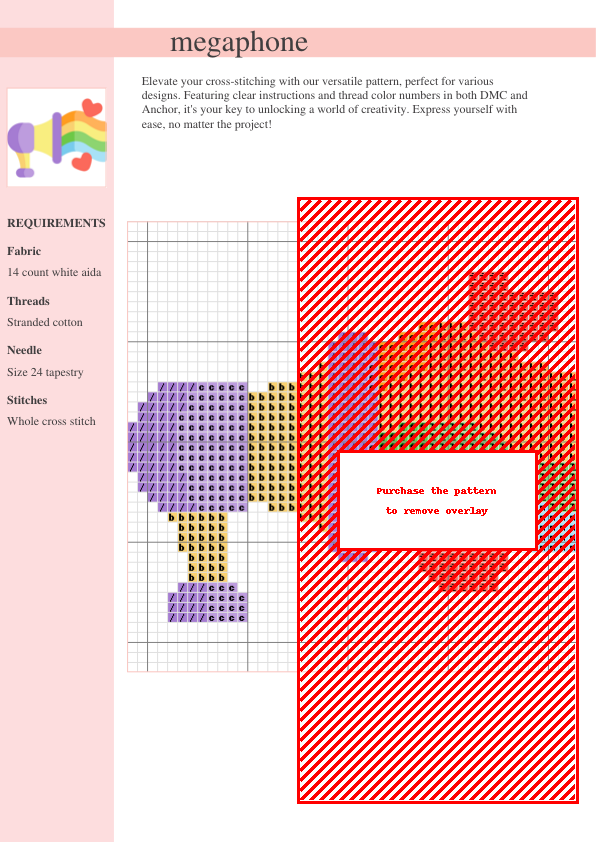 Craft a bold and colorful statement with our Megaphone Cross Stitch Pattern! This easy-to-follow pattern uses both DMC & Anchor thread codes, perfect for adding a fun, vibrant touch to your projects. Instant PDF download – start stitching today!