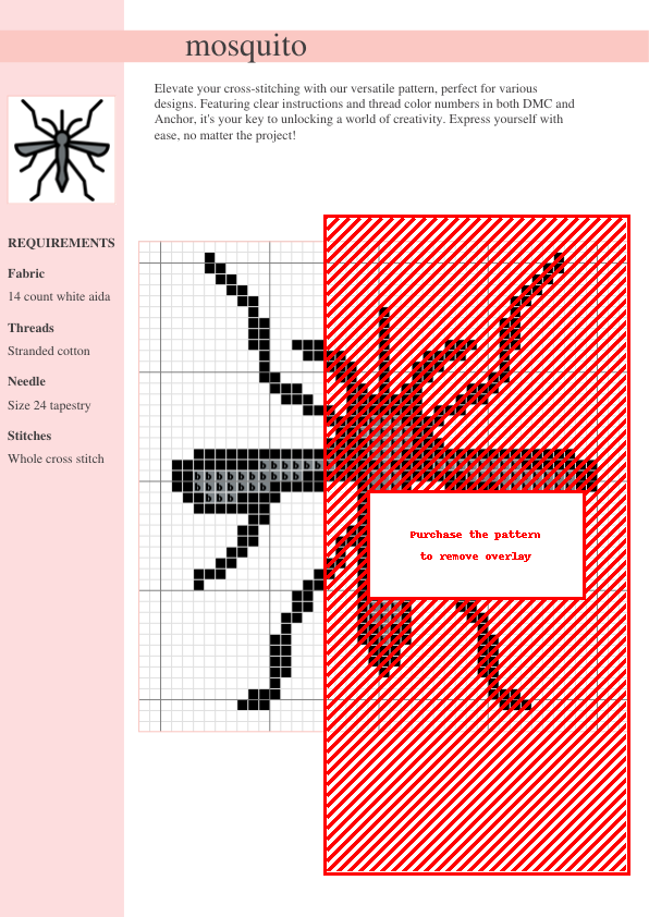 Unleash your creativity with our charming Whimsical Mosquito Cross-Stitch Pattern! This delightful design features a meticulously detailed mosquito, adding a touch of unexpected whimsy to your crafting projects. The intricate stitching brings this unusual subject to life, perfect for creating unique samplers, eye-catching wall art, or even embellishing clothing and accessories. This easy-to-follow, two-page PDF pattern includes both DMC and Anchor thread color codes, a clear symbol key, and a comprehensive color chart, ensuring a smooth and enjoyable stitching experience for cross-stitchers of all skill levels. Download instantly after purchase and begin your stitching adventure! Perfect for creating a conversation-starting piece for your home or a thoughtful, handmade gift. The pattern’s accessible design makes it a great choice for beginners and experienced stitchers alike, adding a touch of unique personality to any project. Let your needlework buzz with creativity! This quirky pattern is sure to be a fun and rewarding project.