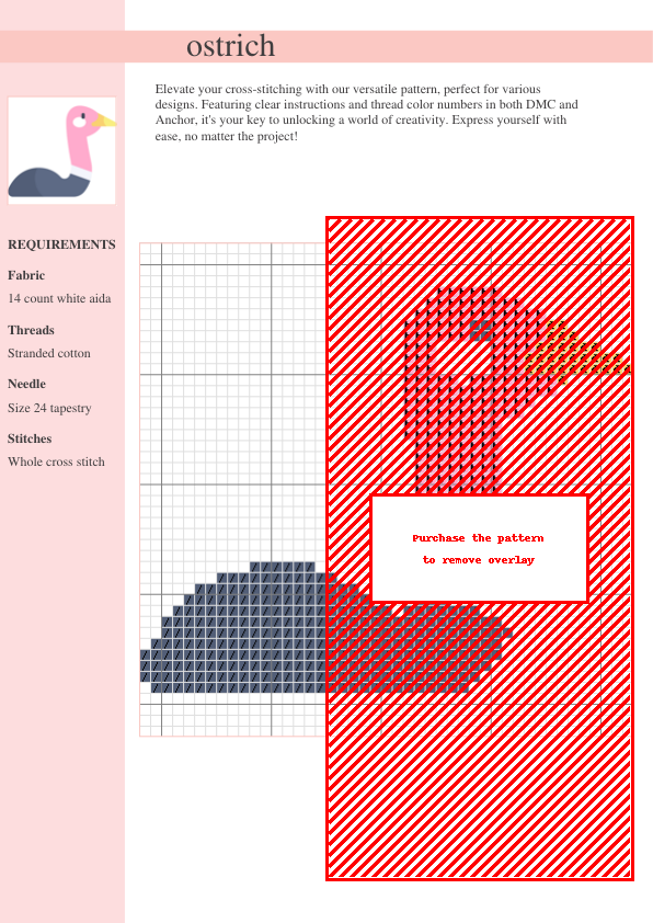 Downloadable PDF pattern for a stunning ostrich cross stitch design. Features detailed instructions, DMC & Anchor thread color charts, and is perfect for intermediate to advanced stitchers seeking an elegant and rewarding project. Create a magnificent wall hanging, pillow, or unique gift!