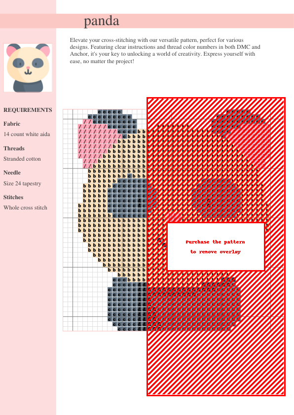 Unleash your inner artist with this charming Panda Cross Stitch Pattern! This delightful design features a cute panda in a soft, dreamy pastel color palette, perfect for adding a whimsical touch to your home dΓ©cor or creating a thoughtful handmade gift. Ideal for both beginner and experienced cross-stitchers, this pattern offers a rewarding and relaxing crafting experience. The clear and easy-to-follow instructions include both DMC and Anchor thread color codes for a seamless stitching process. This downloadable PDF pattern provides a detailed color chart, a complete thread list with color conversions, and helpful tips to ensure a smooth and enjoyable stitching journey. The intricate details of the panda’s fur and expressive eyes add a unique and endearing touch to this design. Notice the subtle shading that brings this cuddly creature to life! Download instantly and start stitching your cuddly friend today! Experience the joy of crafting with this whimsical and adorable panda pattern. Perfect for framing, adding to a pillow, or even incorporating into a larger sampler.