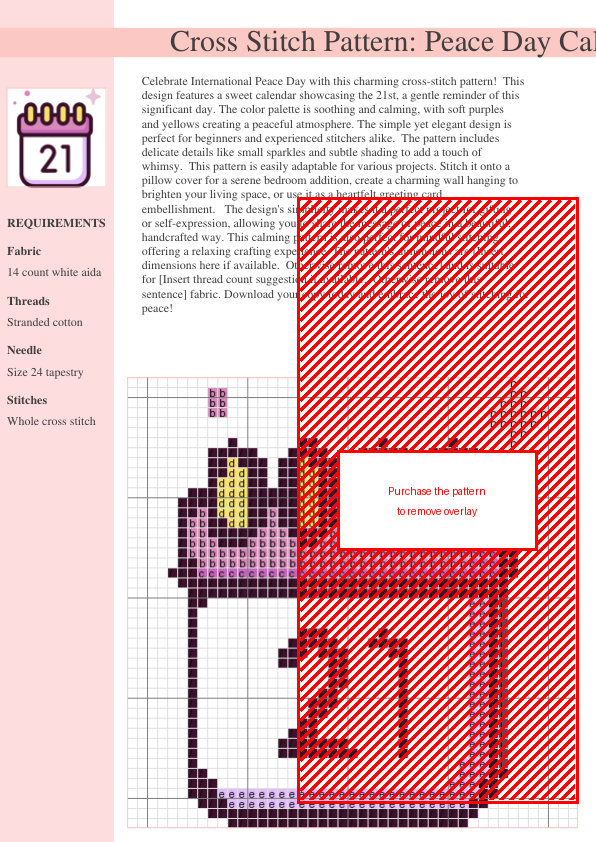 Embrace tranquility with our charming cross-stitch pattern celebrating International Peace Day! This design delicately features the 21st, a sweet reminder of peace and serenity. The soothing color palette of soft purples, calming yellows, and subtle shading creates a relaxing atmosphere, perfect for mindful stitching and relaxation. The intricate details, including tiny sparkling accents, add depth and whimsy, making this pattern a joy to stitch, whether you’re a beginner or an experienced cross-stitcher. This versatile pattern is perfect for a variety of projects: imagine it as a serene pillow cover, a charming wall hanging, a unique greeting card, or even a beautiful addition to a larger sampler. Share the message of peace through handcrafted artistry. Download your pattern and experience the joy of stitching for peace! This pattern includes a full-color key, easy-to-follow instructions, and a stitch count of [Insert Stitch Count Here]. Suitable for intermediate stitchers. Keywords: cross stitch, cross stitch pattern, peace, calendar, International Peace Day, mindful stitching, relaxation, purple, yellow, home decor, wall hanging, pillow cover, greeting card, crafting, embroidery, needlepoint, DIY, handmade, intermediate.