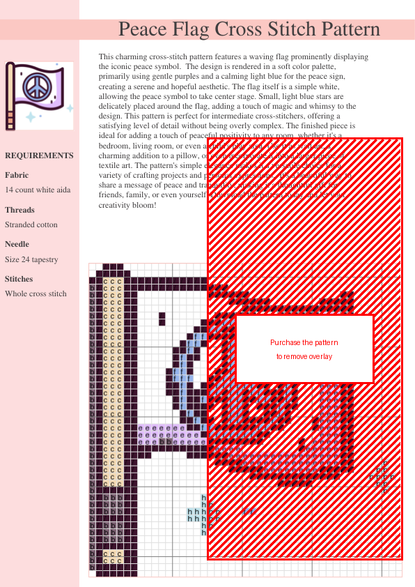 Embrace tranquility with our ‘Peaceful Flag’ cross-stitch pattern! This charming design showcases a gently waving peace flag in a soothing palette of soft purples, light blues, and crisp white. The iconic peace symbol is beautifully accented by delicate light blue stars, creating a serene and hopeful atmosphere. Perfect for intermediate stitchers, this pattern offers a satisfying challenge without being overly complex. The finished piece, approximately 6″ x 8″ (easily adjustable to your preferred size), is ideal for wall art, pillow embellishment, or integrating into larger textile projects such as blankets or tote bags. Imagine the peaceful ambiance it will bring to your home or the thoughtful sentiment it conveys as a handmade gift. This digital download includes a detailed color key, a precise symbol chart, and clear, easy-to-follow instructions for a relaxing and rewarding stitching experience. Download instantly and let the calming process begin! Create a piece that reflects your love for peace and tranquility. This pattern is a wonderful choice for experienced beginners or those seeking a mindful crafting project.