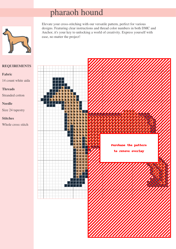 Embark on a rewarding cross-stitch journey with our breathtaking Pharaoh Hound pattern! This intricate design showcases the regal elegance of this ancient breed, capturing its distinctive features with lifelike detail. The pattern’s complexity makes it perfect for intermediate to advanced stitchers seeking a challenging yet fulfilling project. Clear, easy-to-follow instructions and a comprehensive color key using both DMC and Anchor stranded cotton thread numbers are included, ensuring a smooth stitching experience. Imagine the stunning results: a framed masterpiece adorning your home, a thoughtful and unique gift for a dog lover, or a cherished addition to your personal textile art collection. Download your PDF pattern instantly and unleash your creativity! This pattern is a testament to the beauty of cross-stitch and the majestic Pharaoh Hound. The elegant lines and detailed textures will make this a project you’ll be proud to display.