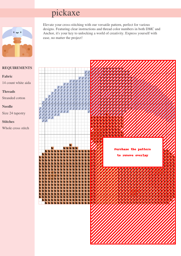 Download this charming cross-stitch pattern of a detailed pickaxe! Includes DMC & Anchor thread charts, easy-to-follow instructions, and is perfect for both beginner and experienced stitchers. Instant PDF download for immediate crafting enjoyment!