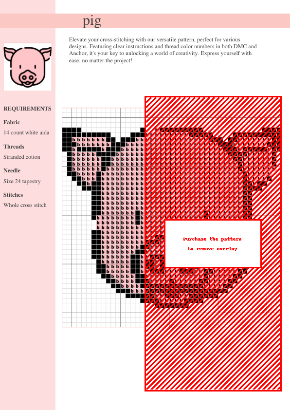Stitch up some adorable charm with this delightful pig cross-stitch pattern! Perfect for beginners and experienced stitchers alike, this whimsical design features a charming pig rendered in exquisite detail. The pattern includes clear, easy-to-follow instructions and a comprehensive color key using both DMC and Anchor thread numbers, making it simple to gather your materials. The downloadable PDF includes a symbol-based pattern chart and a complete thread list, ensuring a smooth and enjoyable crafting experience. Create a heartwarming wall hanging, charming ornament, unique pig-themed decoration, or a fun patch – the possibilities are endless! Unleash your creativity and add a touch of oink-tastic fun to your cross-stitch projects. Download your PDF instantly after purchase. This pattern is a perfect addition to your cross stitch projects, animal cross stitch collection, or farm-themed crafts. The design is perfect for adding a touch of rustic charm or playful whimsy to your home décor. This pattern uses a combination of popular DMC and Anchor threads, making it easy to source materials. The detailed chart makes it suitable for both confident and new stitchers. Imagine the joy of creating this endearing piece – a perfect gift or a lovely addition to your own handcrafted collection.