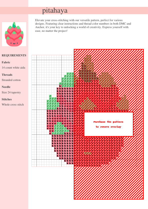 Downloadable PDF cross-stitch pattern featuring a vibrant Pitahaya (dragon fruit). Clear instructions, DMC & Anchor thread color charts included. Perfect for all skill levels. Create a beautiful tropical-themed cross-stitch masterpiece!