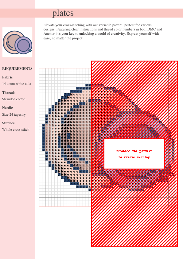 Downloadable PDF cross-stitch pattern of charming plates. Includes easy-to-follow instructions, DMC & Anchor thread color charts, perfect for home décor, kitchen projects, or gifting. A delightful and moderately challenging project for cross-stitch lovers!