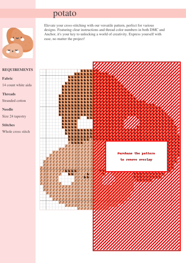 Craft an adorable potato cross-stitch with our easy-to-download PDF pattern! Featuring clear instructions, DMC & Anchor thread color codes, and a cute, whimsical design, it’s perfect for beginners and experienced stitchers alike. Download instantly and start your next fun crafting project!