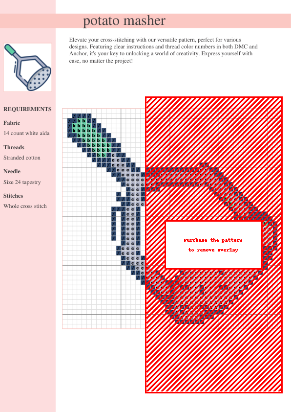 Add a touch of quirky charm to your kitchen or a loved one’s with our delightful Potato Masher cross-stitch pattern! This versatile design is perfect for creating charming kitchen décor, unique dish towels, or even a fun addition to a larger sampler. Featuring a detailed yet easy-to-follow design, it’s suitable for cross-stitchers of all skill levels, from beginner to advanced. The pattern includes clear instructions and color charts, conveniently listing thread colors in both DMC and Anchor brands for easy thread selection. This downloadable PDF pattern provides a two-page document with a symbol key, a comprehensive thread list, and a visual representation of the finished product, ensuring a smooth and enjoyable stitching experience. Stitched in earthy, rustic tones, this design adds a touch of warmth and whimsy to your needlework. Imagine the cozy charm and create a unique piece of handmade art to brighten your kitchen or give as a thoughtful, handcrafted gift! This instant download allows you to start your project immediately. Perfect for cross stitch beginners and experienced stitchers alike, this pattern offers a satisfying and rewarding crafting experience.