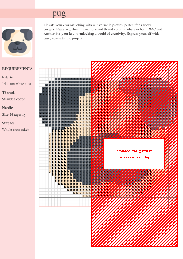 Stitch up some adorable charm with our delightful Pug Cross Stitch Pattern! This easy-to-follow PDF download features a charming pug design, perfect for beginners and experienced cross-stitch enthusiasts. The pattern includes a clear, color-coded chart with symbols, making it simple to follow along. A comprehensive thread list is provided, utilizing both DMC and Anchor thread numbers for your convenience. This versatile pattern lends itself to various crafting projects. Create a unique piece for yourself, a heartwarming gift for a loved one, or add a personal touch to home decor such as a pillow, wall hanging, or even a cute pet portrait. Unleash your creativity and enjoy the therapeutic process of bringing this sweet pug to life with your needle and thread! The pattern is instantly downloadable after purchase, allowing you to start stitching your adorable pug immediately. Experience the joy of crafting with this delightful and accessible design.