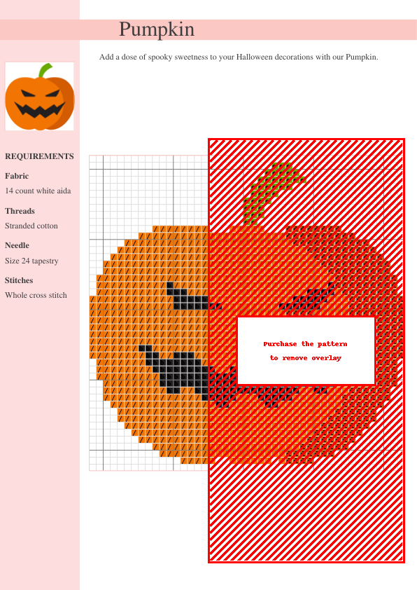 Create a charming and spooky Halloween cross stitch with our easy-to-follow Pumpkin design. This pattern features intricate details and is perfect for adding a cute and spooky touch to your autumn décor. Suitable for all skill levels. Instant digital download! Perfect for beginners and experienced cross-stitchers alike. Download and start stitching today!