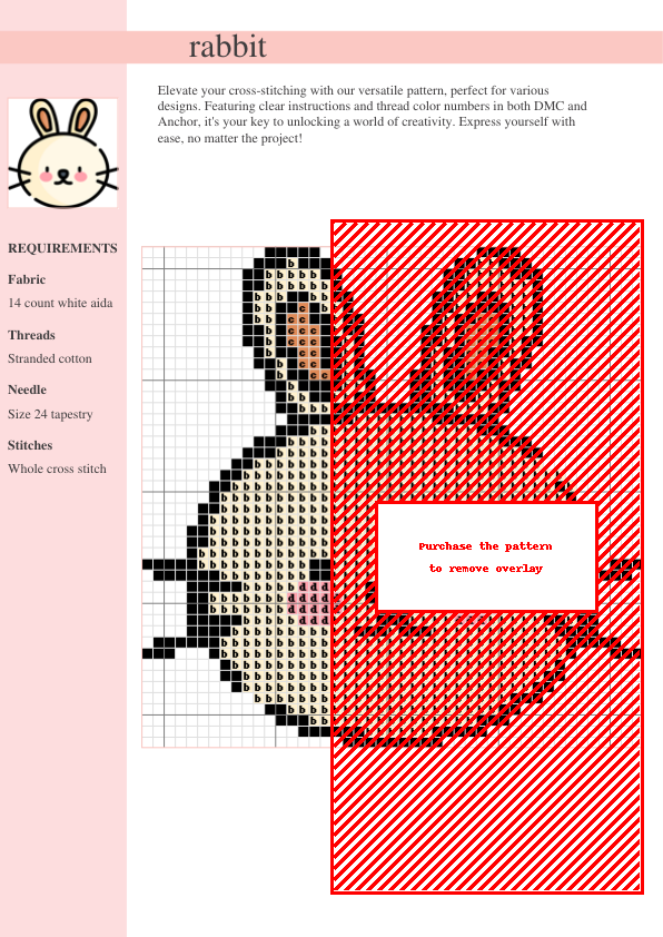 Instant download! Create an adorable sitting bunny cross-stitch. This easy pattern includes DMC and Anchor thread color codes, a detailed symbol chart, and color key. Perfect for beginners and experienced stitchers. Ideal for wall art, pillows, or gifts!