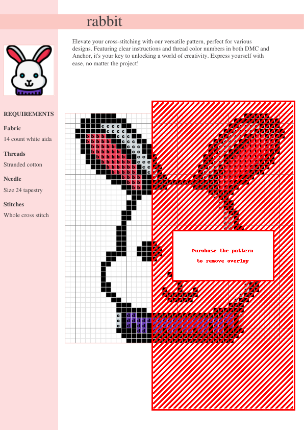 Stitch up springtime charm with our delightful bunny cross-stitch pattern! This design is perfect for beginner to intermediate stitchers seeking a rewarding crafting experience. The endearing bunny is rendered in a pleasing pastel color palette – think soft pinks, blues, and yellows – easily customizable to your preferences for a truly personalized touch. Clear, easy-to-follow instructions are included, along with convenient DMC and Anchor thread color codes for effortless supply gathering. Instantly download your PDF pattern after purchase; it contains a detailed symbol chart, a comprehensive thread list for both DMC and Anchor brands, and even helpful tips for achieving a professional finish. This charming design is ideal for adding whimsical charm to pillows, wall hangings, or creating unique, handmade gifts. The intricate details, such as delicate whiskers and fluffy tail, make this a satisfying project for crafters of all skill levels. Let your creativity bloom with this adorable bunny cross-stitch project and add a touch of handmade joy to your home or surprise a loved one with a personalized, heartfelt gift. Perfect for Easter crafts, spring-themed home decor, or simply adding a touch of cuteness to your day.