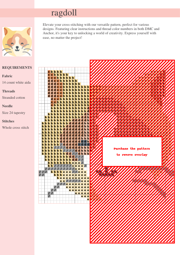 Create an adorable ragdoll cross-stitch with this easy-to-follow pattern! Includes both DMC and Anchor thread color charts for convenience. Instant PDF download – start stitching your charming ragdoll today!