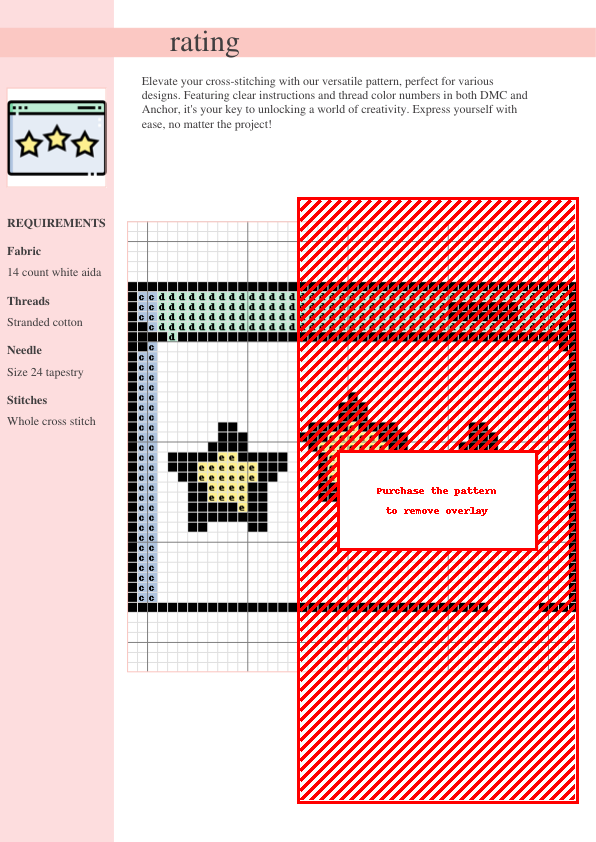 Elevate your crafting with our ‘Rating’ cross-stitch pattern! This modern and versatile design seamlessly blends clean lines with effortless elegance, making it perfect for both beginner and experienced stitchers. The easily-stitchable design is surprisingly quick to complete, yet delivers a visually striking result. This detailed, two-page PDF pattern includes a color-coded symbol chart for easy reference and a comprehensive thread list compatible with both DMC and Anchor threads, ensuring a smooth and enjoyable stitching experience. Unleash your creativity and transform this design into a chic pillow cover, a statement wall hanging, or a unique embellishment for clothing and accessories. Download your instant PDF pattern and begin crafting your masterpiece! This design is ideal for adding a touch of modern sophistication to your home décor or personal projects. The clean color palette makes it easily adaptable to various color schemes and design preferences. Perfect for cross-stitch enthusiasts seeking a stylish and satisfying project that won’t take up too much time.