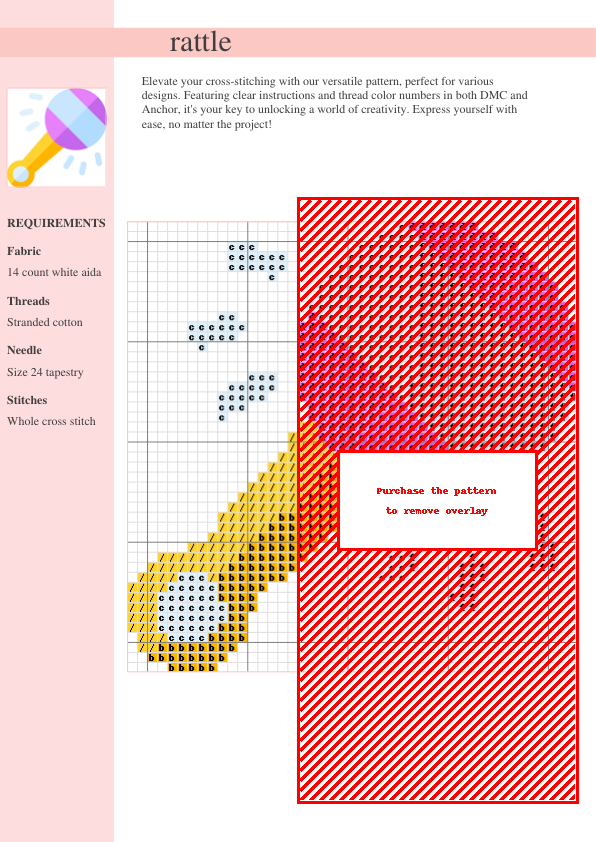 Create an adorable handmade baby rattle with this easy cross-stitch pattern! Includes clear instructions, DMC & Anchor thread color keys, a complete assembly guide with diagrams and images, and instant PDF download. Perfect for baby showers, nursery décor, or a unique baby gift! A delightful project for cross-stitch enthusiasts of all skill levels.