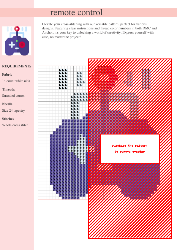 Stitch up some tech-inspired charm with our ‘Pixelated Perfection: Remote Control’ cross-stitch pattern! This modern and quirky design features a meticulously crafted pixel art representation of a remote control, perfect for adding a unique touch to your home décor or gifting to a tech-savvy friend. The pattern is an instant PDF download, providing clear symbols and color charts compatible with both DMC and Anchor threads. This easy-to-follow, two-page PDF includes a comprehensive thread list (DMC and Anchor thread codes), ensuring a smooth stitching experience for all skill levels. The pixelated detail adds a fun, modern twist to traditional cross-stitch. Embark on a rewarding crafting journey and create this pixelated masterpiece! Whether you’re a seasoned cross-stitcher looking for a fun, modern project or a beginner seeking a satisfying challenge, this pattern promises a delightful stitching experience. Download now and start stitching!
