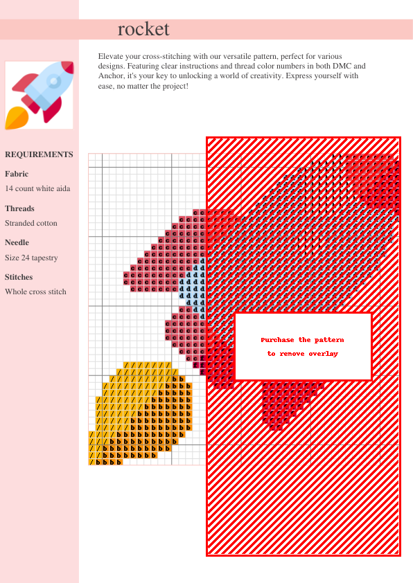 Create a dazzling ‘Blast Off!’ Rocket cross stitch! This easy-to-follow PDF pattern includes DMC and Anchor thread color codes, stitch count, and a full-color symbol chart for a seamless stitching experience. Instant download! Perfect for beginners and intermediate stitchers.