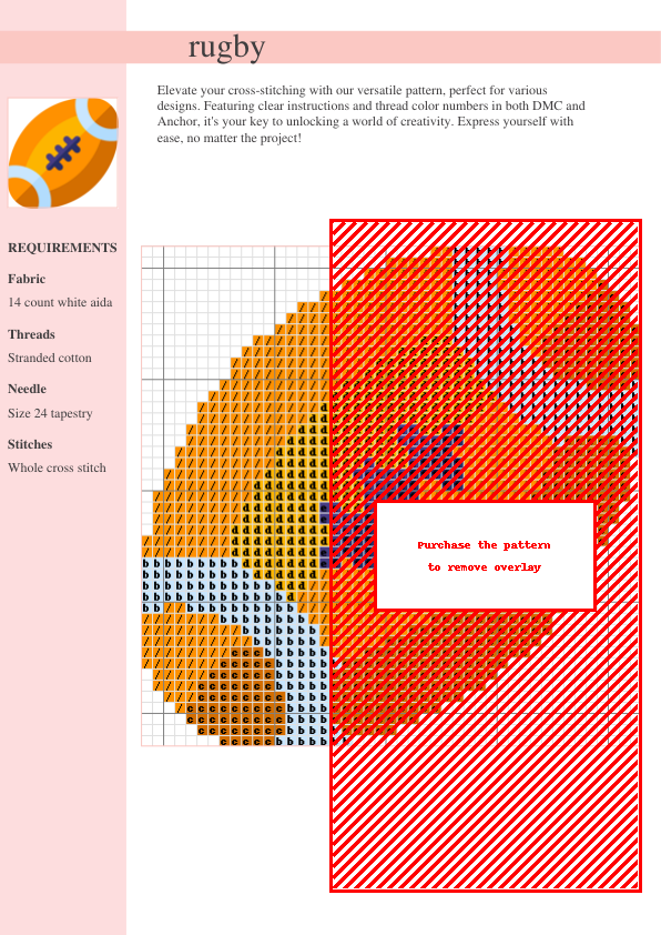 Celebrate your love for rugby with this dynamic cross-stitch pattern! Perfect for intermediate to advanced stitchers, this design captures the energy of the game with a realistic rugby ball, cheering fans, and dynamic players in action within a vibrant stadium scene. The intricate details and rich color palette create a truly captivating piece. This easy-to-follow pattern is presented as a clear, two-page downloadable PDF chart, featuring a comprehensive color key listing both DMC and Anchor stranded cotton thread colors for your convenience. Imagine this stunning cross-stitch adorning a cozy pillow, adding a sporty touch to a wall hanging, or becoming a centerpiece in a larger sampler. A thoughtful and unique gift for rugby enthusiasts, athletes, or needlework lovers, this pattern guarantees a rewarding stitching experience and a truly impressive piece of handcrafted art. Unleash your creativity and show your team spirit with every stitch! This pattern is available for instant download after purchase. Download your pattern and get stitching today!