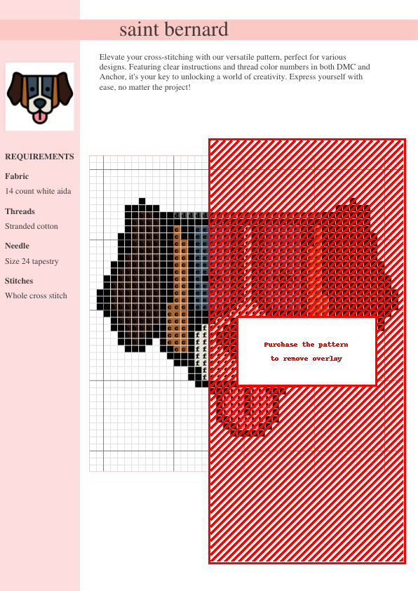 Stitch up heartwarming canine charm with our delightful Saint Bernard cross stitch pattern! This endearing design is perfect for cross-stitch enthusiasts of all skill levels, from beginners to experienced stitchers. The pattern showcases a detailed and lovingly rendered Saint Bernard, capturing its gentle expression and fluffy fur with precision. We’ve ensured a smooth stitching experience by providing clear, easy-to-follow instructions, complete with comprehensive DMC and Anchor thread color codes for effortless color matching. The downloadable PDF includes a two-page symbol chart for simple navigation and a complete thread list, making your stitching journey a breeze. Create a beautiful piece of needlepoint art to proudly display in your home, gift to a beloved friend or family member, or add to your growing collection of cherished cross-stitch projects. This pattern is ideal for showcasing your needlepoint skills and adding a touch of canine cuteness to your life. Enjoy the therapeutic process and the rewarding results! Perfect for dog lovers and cross-stitch enthusiasts! Download your pattern instantly and start stitching today!