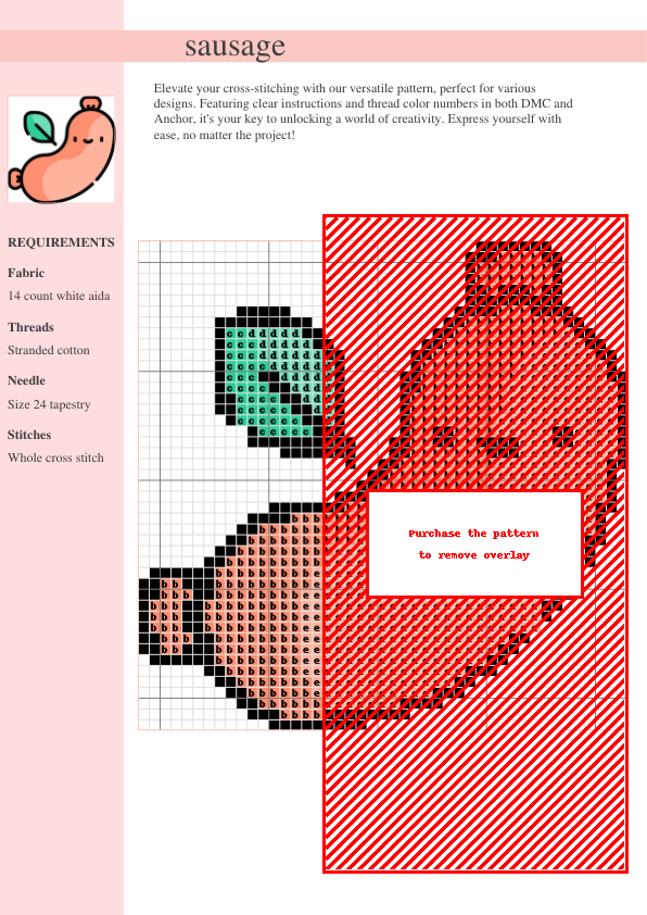 Spice up your kitchen or add a touch of quirky charm to your home with our adorable Sausage Cross Stitch Pattern! This delightful design features a cheerful sausage rendered in vibrant colors, perfect for stitching onto kitchen towels, tote bags, or even a fun pillow. The pattern boasts a playful, whimsical style that’s sure to bring a smile. This easy-to-follow pattern includes clear color symbols, a comprehensive thread color chart listing both DMC and Anchor thread numbers for your convenience, and detailed instructions. After purchase, you’ll instantly receive a downloadable two-page PDF containing the pattern chart and a complete thread list. This versatile pattern is ideal for cross-stitch enthusiasts of all skill levels, from beginners seeking a fun, quick project to experienced stitchers looking for a unique and rewarding design. Imagine the fun of stitching this unique sausage design and adding a touch of personality to your needlepoint, kitchen crafts, or home decor projects! Download your pattern today and let your creativity sizzle!