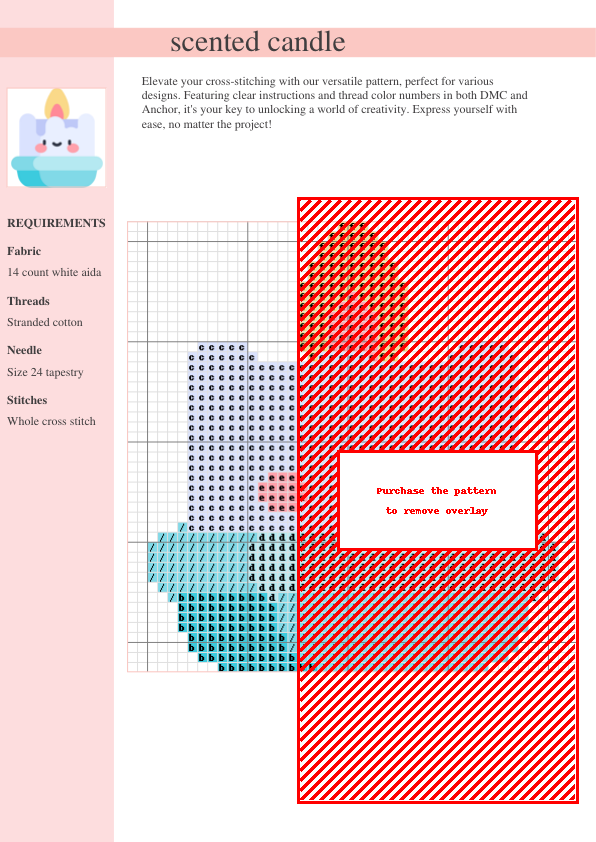 Downloadable PDF cross-stitch pattern of a charming scented candle. Includes DMC & Anchor thread color codes, easy-to-follow instructions, and is perfect for all skill levels. Create a cozy handmade gift or beautiful home decoration! Instant download. Perfect for beginners and experienced stitchers alike.