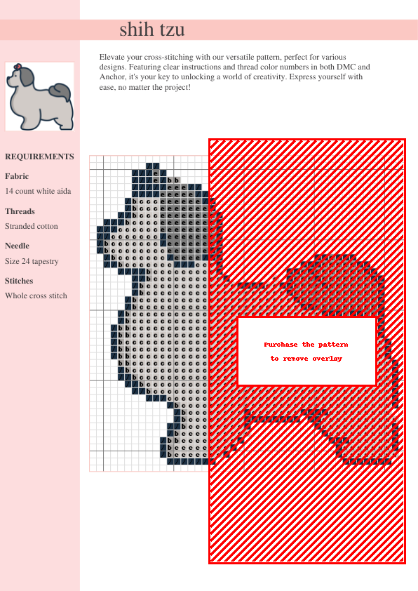 Stitch up some canine cuteness with this delightful Shih Tzu cross-stitch pattern! This easy-to-follow design features clear symbols and a comprehensive color key using both DMC and Anchor thread numbers, making it perfect for cross-stitchers of all skill levels. The instant PDF download includes a detailed two-page pattern chart with easy-to-read symbols and a complete list of required DMC and Anchor thread codes. The intricate details beautifully capture the Shih Tzu’s endearing features β its fluffy fur, expressive eyes, and charming personality. The pattern’s color palette is both versatile and delightful, lending itself to various home decor styles. Perfect for home decor, a personalized gift for a pet lover, or incorporating into a larger needlepoint project. This pattern offers a rewarding stitching experience, whether you’re a beginner or an experienced crafter. Download now and unleash your creativity! Add a touch of whimsical charm to your life with this adorable needlework project. This charming design makes for a perfect handmade gift for dog lovers or a delightful addition to your own cozy home decor.
