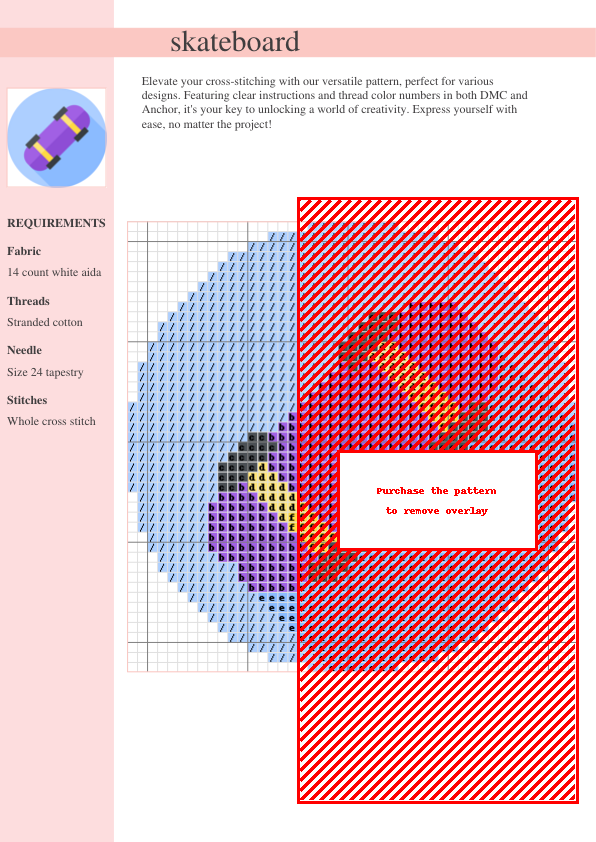 Cruise into creativity with our ‘Cool Ride’ Skateboard cross-stitch pattern! This vibrant design captures the energy of skateboarding, perfect for home decor, gifts, or showcasing your passion. The detailed skateboard illustration is brought to life with precise stitching. Clear instructions and a comprehensive thread color chart (using both DMC and Anchor thread codes) ensure an easy and enjoyable experience. Instantly download your two-page PDF pattern chart (symbols included) and thread list after purchase. Suitable for all skill levels – from beginner-friendly fun to a rewarding challenge for experienced stitchers. Create wall art, cushion covers, or incorporate it into a mixed-media project. Stitch your passion today! This downloadable pattern offers hours of creative fun and a stylish, handmade result.