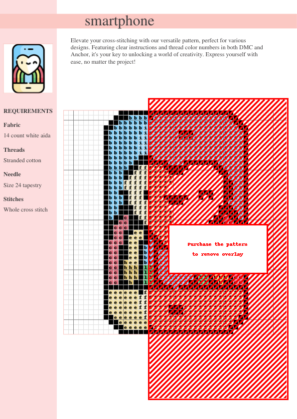 Stitch up a stylish statement piece with our Smartphone Cross Stitch Pattern! This charming design cleverly blends modern technology with the timeless art of cross-stitch, offering a unique and quirky project for crafters of all skill levels. The pattern features a detailed depiction of a smartphone, perfect for adding a tech-inspired touch to your home decor, phone cases, or even pillows. This isn’t your grandma’s cross-stitch! The easy-to-follow instructions include a comprehensive color key using both DMC and Anchor thread numbers, ensuring a smooth and enjoyable stitching experience. This two-page pattern utilizes clear, easy-to-read symbols for quick reference and lists all required DMC and Anchor thread codes, minimizing guesswork and maximizing your stitching satisfaction. The design is both modern and nostalgic, perfect for adding a personalized touch to your handmade gifts or home decor. Download your instant PDF pattern and unleash your creative potential. Suitable for beginners and experienced stitchers. Ideal for adding a unique and personalized touch to your home, gifts, or tech accessories. Finished project size details [add finished size here if available].
